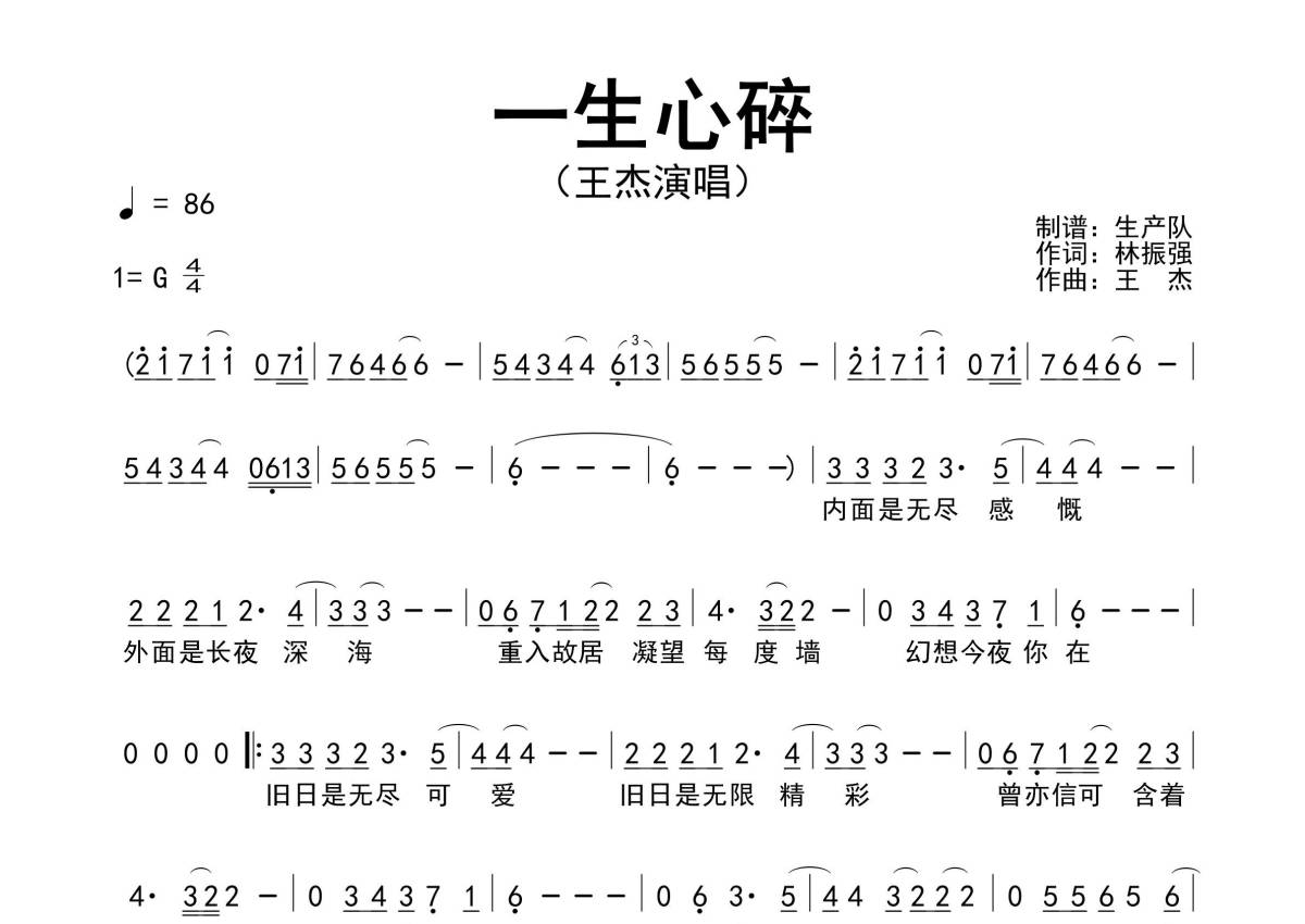 《一生心碎》是王杰演唱的一首歌曲,原版简谱,拍号为4/4拍,歌曲速度为每分钟86拍,这份简谱共有一张高清图谱,图谱由 @生产队 编配上传王杰唱的经典歌曲《一生心碎》原版简谱。