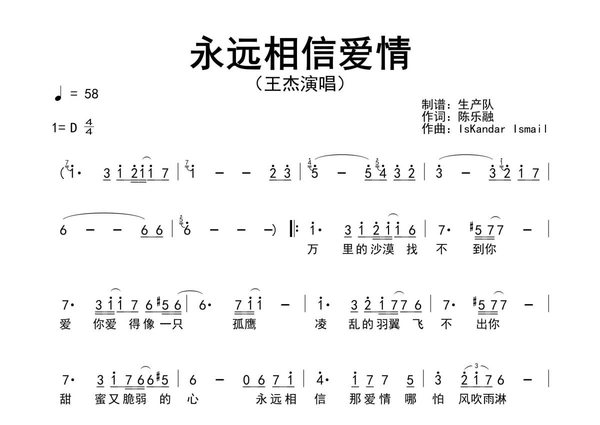 《永远相信爱情》是王杰演唱的一首歌曲,原版简谱,拍号为4/4拍,歌曲速度为每分钟58拍,这份简谱共有一张高清图谱,图谱由 @生产队 编配上传王杰唱的经典歌曲《永远相信爱情》原版简谱。