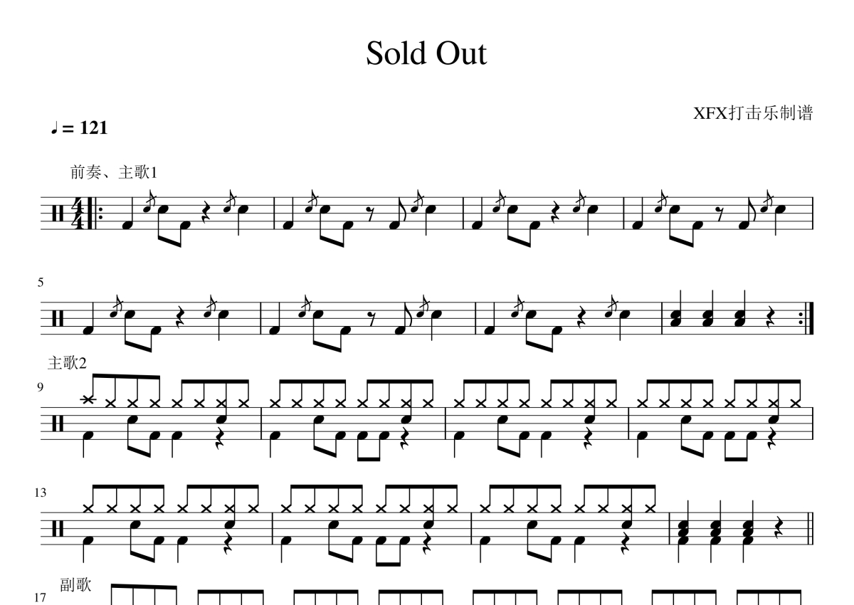 《Sold Out》是Hawk Nelson演唱的一首歌曲,拍号为4/4拍,歌曲速度为每分钟121拍,这份架子鼓谱共有两张高清图谱,图谱由 @陈老师 编配上传,图谱使用五线谱编配,使用这份Sold Out架子鼓谱,你将能够轻松地敲打出这首Hawk Nelson的Sold Out,快来尝试吧。