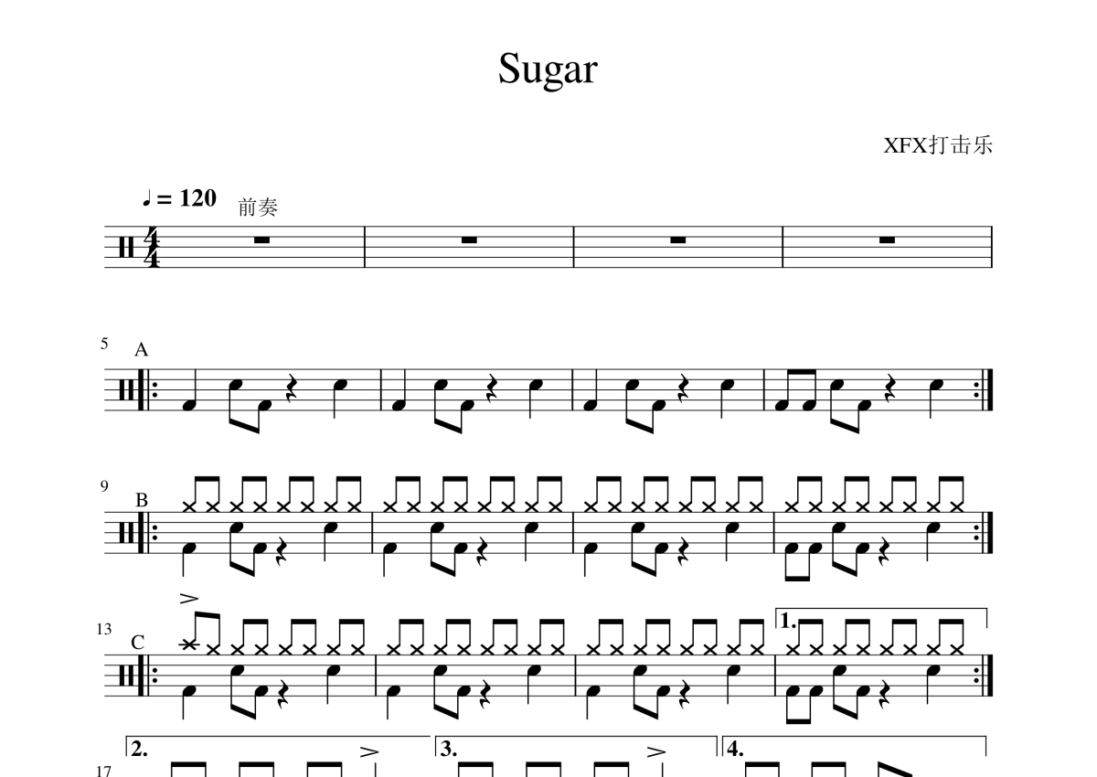 《Sugar》是魔力红演唱的一首歌曲,拍号为4/4拍,歌曲速度为每分钟120拍,这份架子鼓谱共有两张高清图谱,图谱由 @陈老师 编配上传,图谱使用五线谱编配,使用这份Sugar架子鼓谱,你将能够轻松地敲打出这首魔力红的Sugar,快来尝试吧。