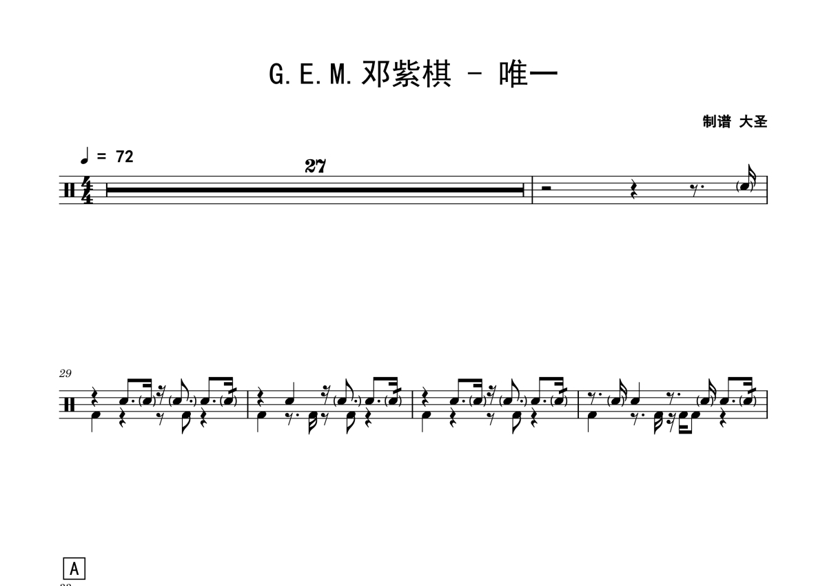 《唯一》是G.E.M.邓紫棋演唱的一首歌曲,拍号为4/4拍,歌曲速度为每分钟72拍,这份架子鼓谱共有两张高清图谱,图谱由 @Sawubona 编配上传,图谱使用五线谱编配,使用这份唯一架子鼓谱,你将能够轻松地敲打出这首G.E.M.邓紫棋的唯一,快来尝试吧。