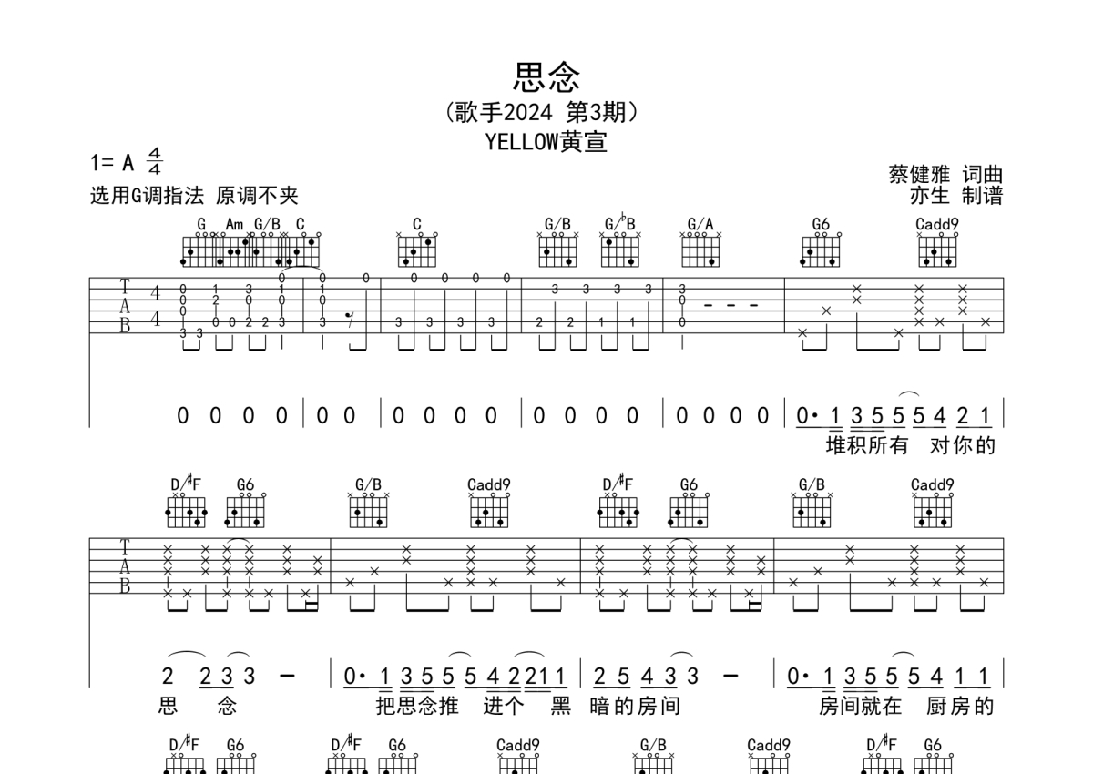 思念吉他谱 - YELLOW黄宣 - G调弹唱六线谱