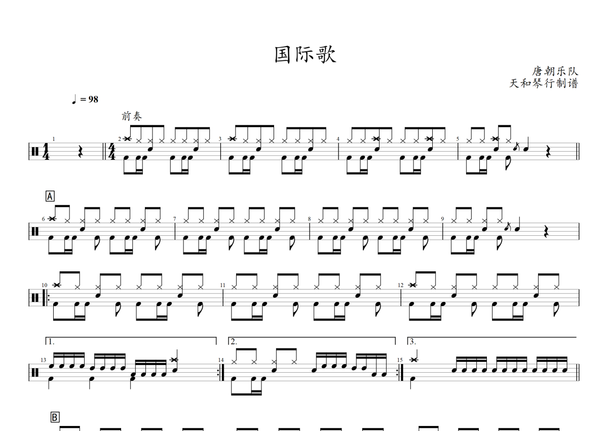 《国际歌》是唐朝乐队演唱的一首歌曲,拍号为4/4拍,歌曲速度为每分钟98拍,这份架子鼓谱共有三张高清图谱,图谱由 @音符喷血者 编配上传,图谱使用五线谱编配,使用这份国际歌架子鼓谱,你将能够轻松地敲打出这首唐朝乐队的国际歌,快来尝试吧。