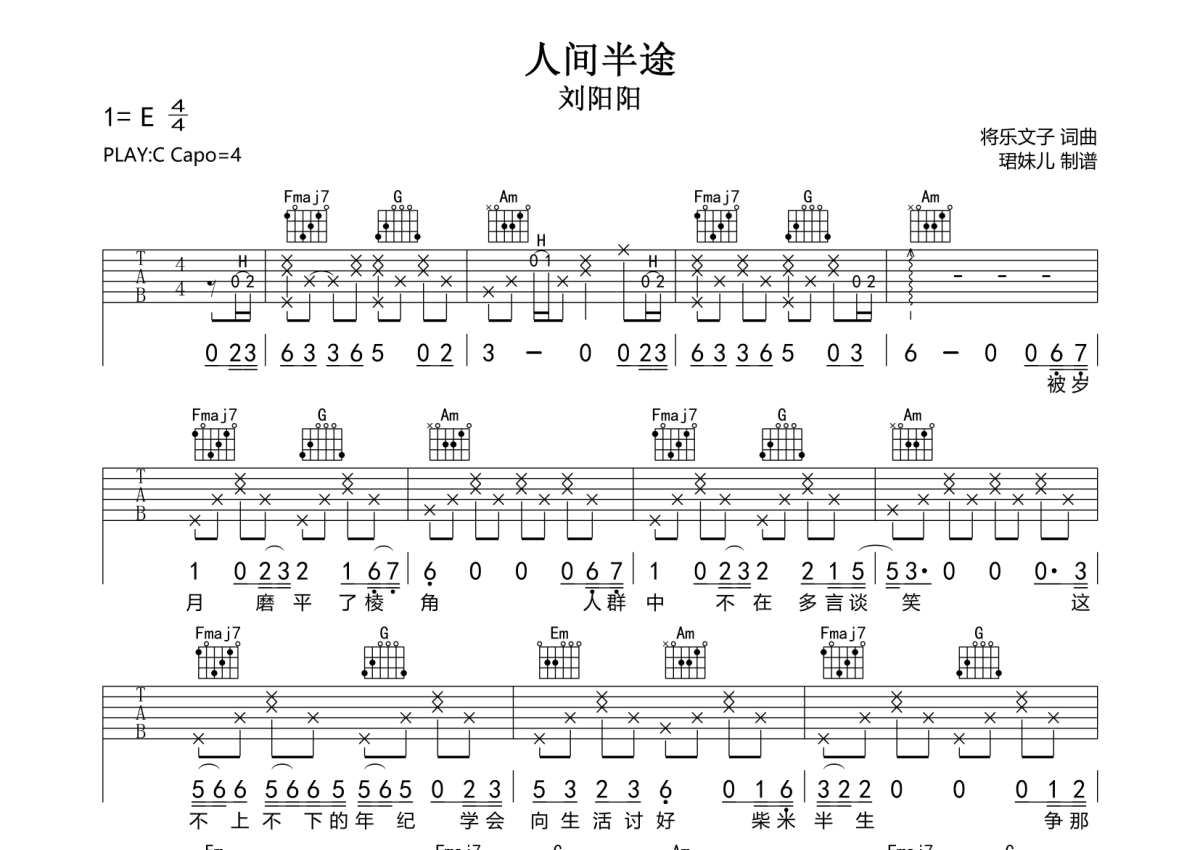 刘阳阳《人间半途》吉他谱 - C调弹唱六线谱