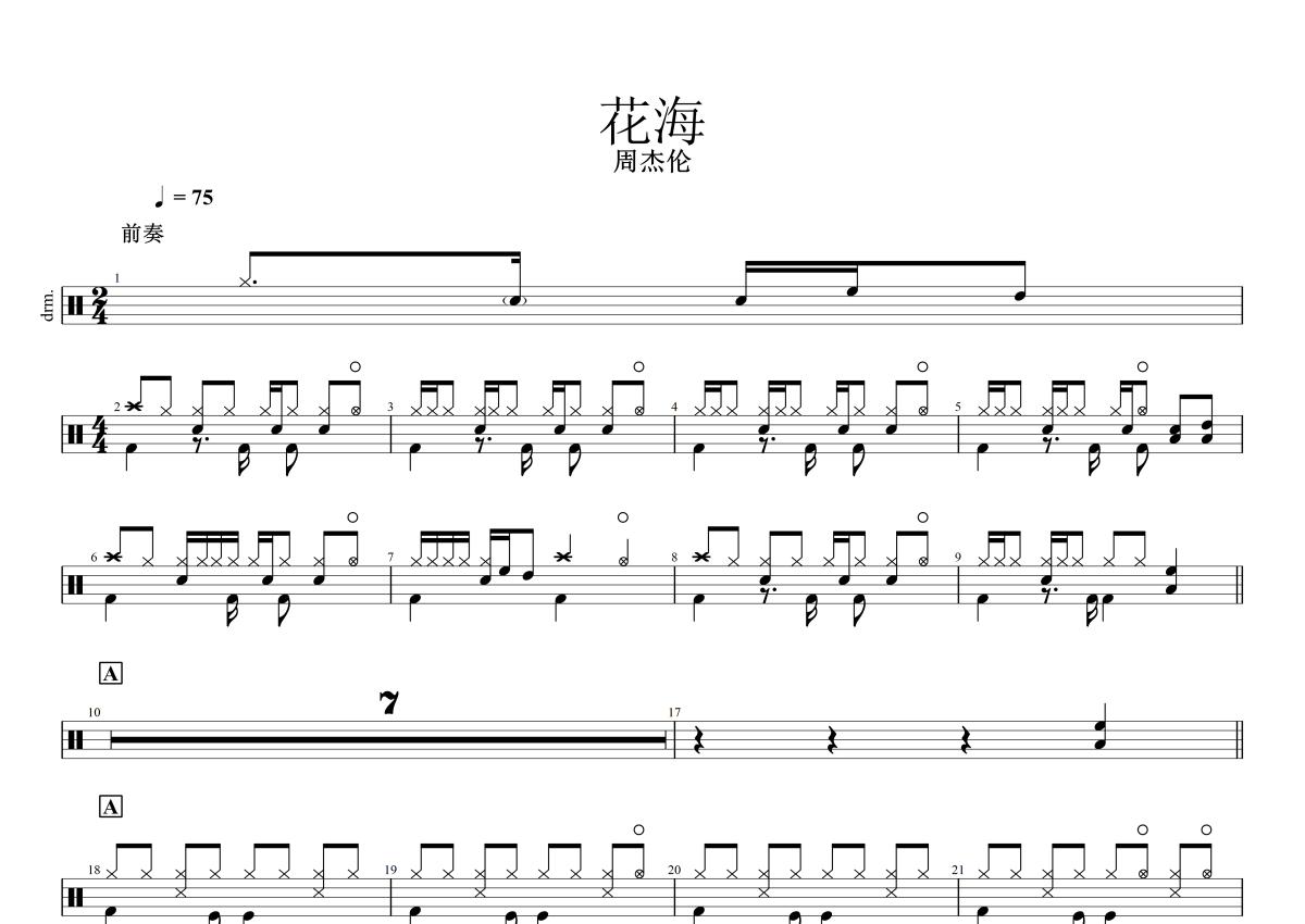 《花海》是周杰伦演唱的一首歌曲,拍号为2/4拍,歌曲速度为每分钟75拍,这份架子鼓谱共有两张高清图谱,图谱由 @小东鼓谱 编配上传,图谱使用五线谱编配,使用这份花海架子鼓谱,你将能够轻松地敲打出这首周杰伦的花海,快来尝试吧。