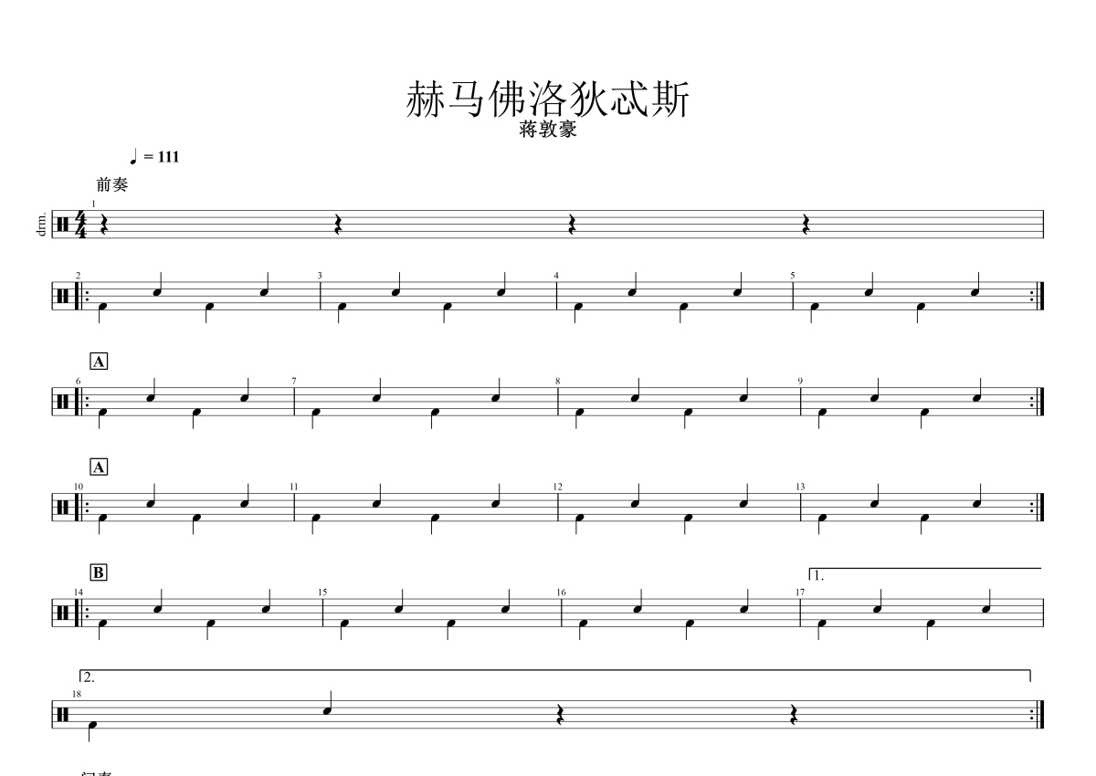 《赫马佛洛狄忒斯》是蒋敦豪演唱的一首歌曲,拍号为4/4拍,歌曲速度为每分钟111拍,这份架子鼓谱共有两张高清图谱,图谱由 @小东鼓谱 编配上传,图谱使用五线谱编配,使用这份赫马佛洛狄忒斯架子鼓谱,你将能够轻松地敲打出这首蒋敦豪的赫马佛洛狄忒斯,快来尝试吧。