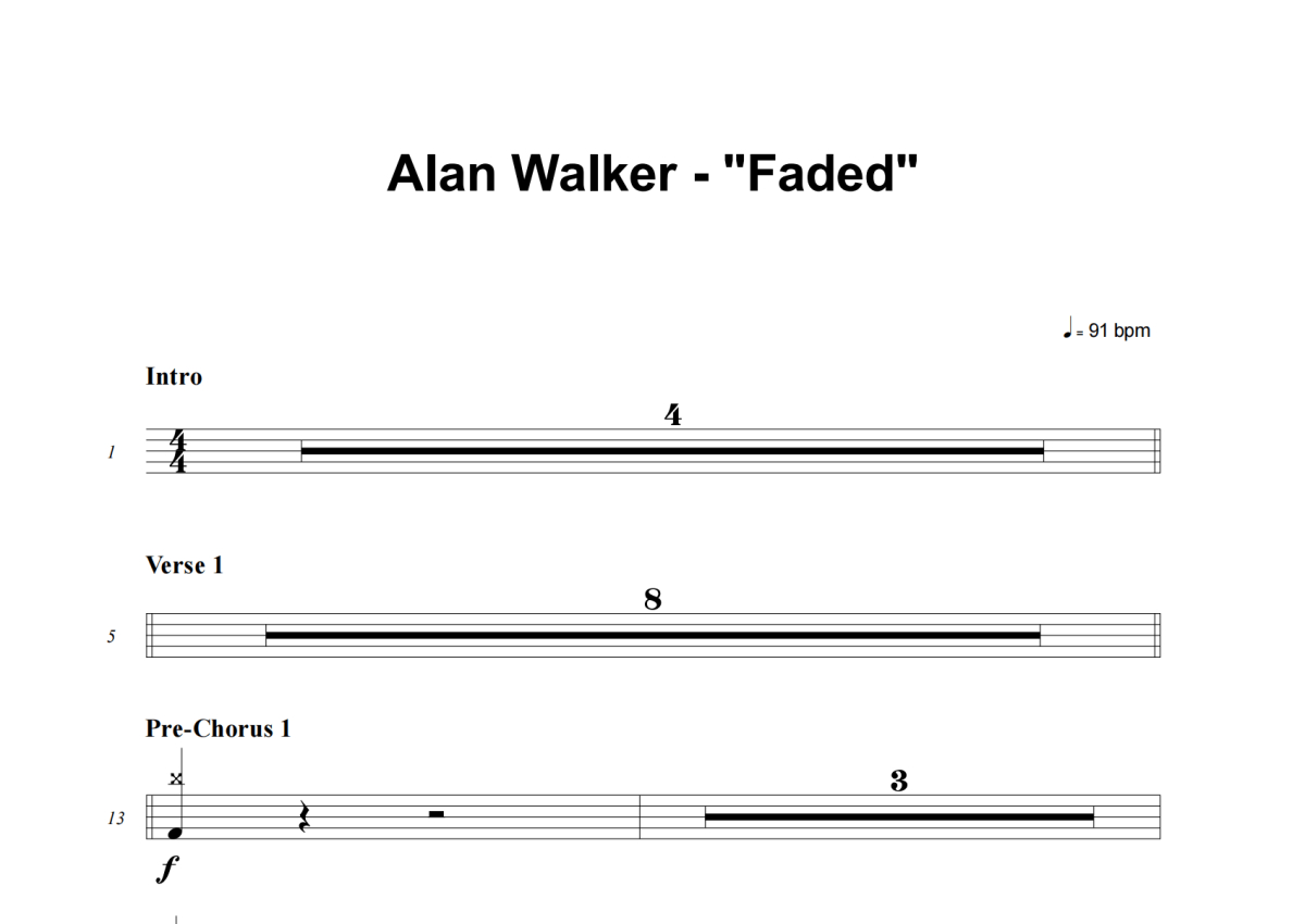 《Faded》是Alan Walker演唱的一首歌曲,拍号为4/4拍,歌曲速度为每分钟91拍,这份架子鼓谱共有两张高清图谱,图谱由 @Sawubona 编配上传,图谱使用五线谱编配,使用这份Faded架子鼓谱,你将能够轻松地敲打出这首Alan Walker的Faded,快来尝试吧。