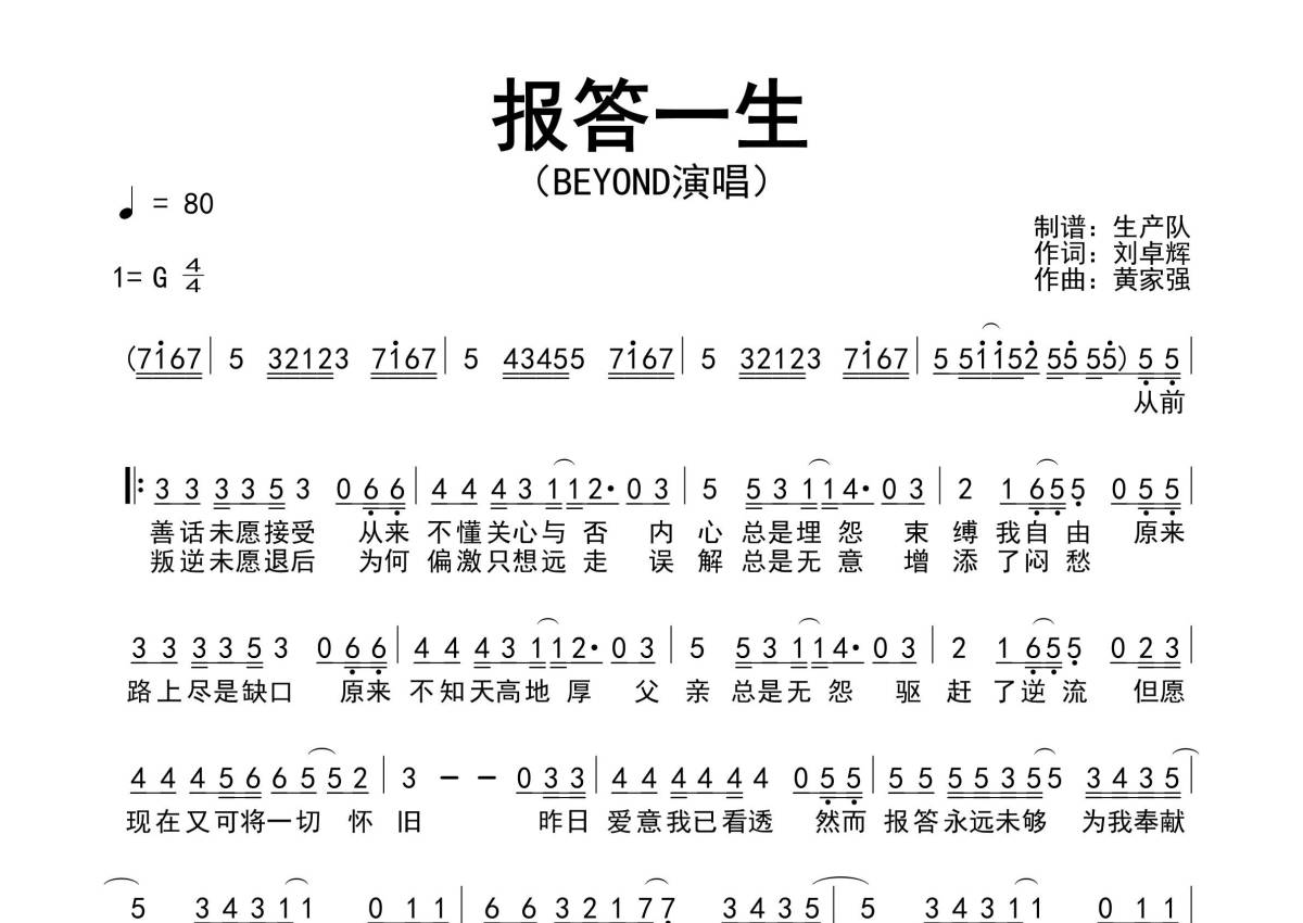 《报答一生》是Beyond演唱的一首歌曲,拍号为4/4拍,歌曲速度为每分钟80拍,这份简谱共有一张高清图谱,图谱由 @生产队 编配上传Beyond演唱的歌曲《报答一生》简谱。