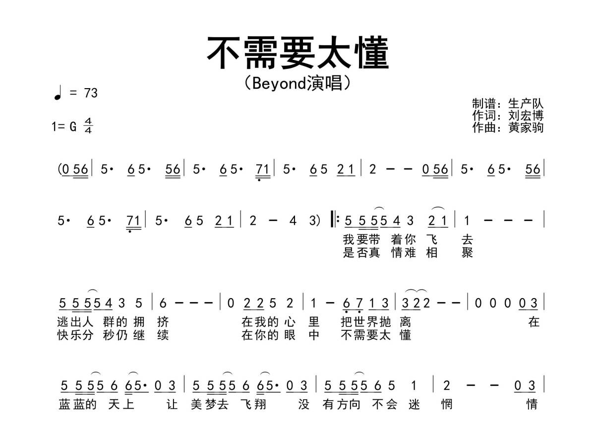 《不需要太懂》是Beyond演唱的一首歌曲,拍号为4/4拍,歌曲速度为每分钟73拍,这份简谱共有一张高清图谱,图谱由 @生产队 编配上传Beyond演唱的歌曲《不需要太懂》简谱。