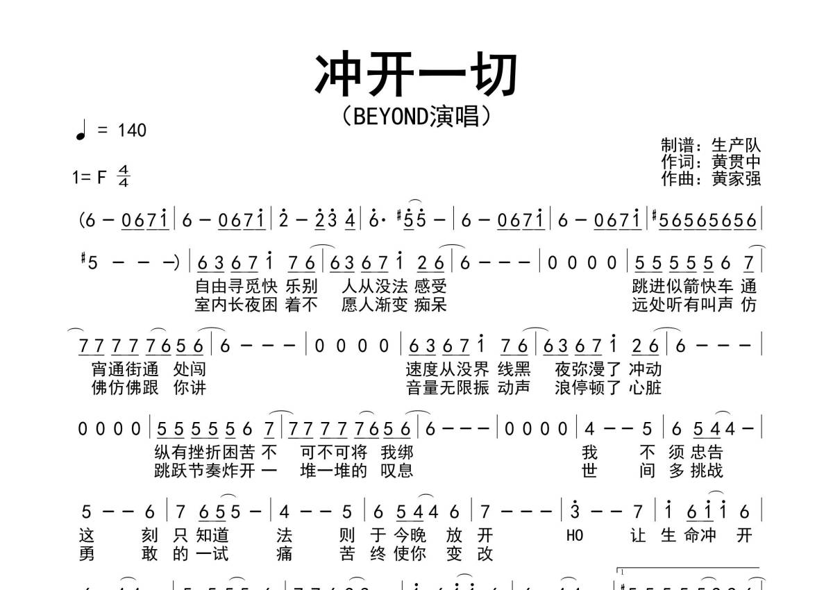 《冲开一切》是Beyond演唱的一首歌曲,拍号为4/4拍,歌曲速度为每分钟140拍,这份简谱共有一张高清图谱,图谱由 @生产队 编配上传Beyond演唱的歌曲《冲开一切》简谱。