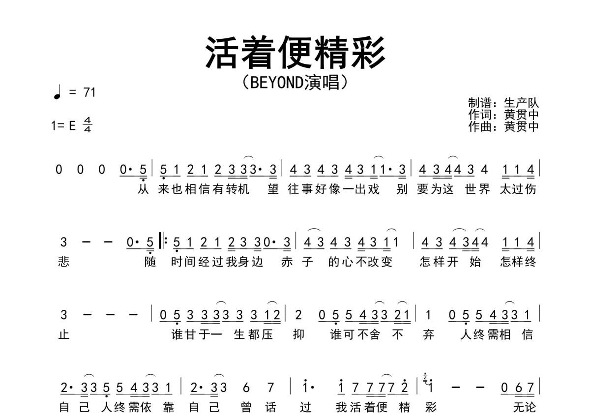 《活着便精彩》是Beyond演唱的一首歌曲,拍号为4/4拍,歌曲速度为每分钟71拍,这份简谱共有一张高清图谱,图谱由 @生产队 编配上传Beyond演唱的歌曲《活着便精彩》简谱。