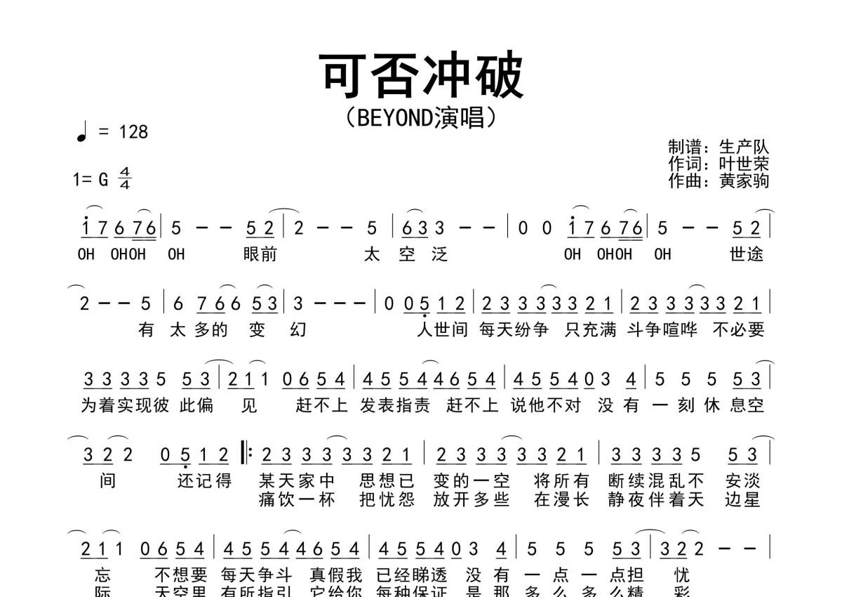 《可否冲破》是Beyond演唱的一首歌曲,拍号为4/4拍,歌曲速度为每分钟128拍,这份简谱共有一张高清图谱,图谱由 @生产队 编配上传Beyond演唱的歌曲《可否冲破》简谱。