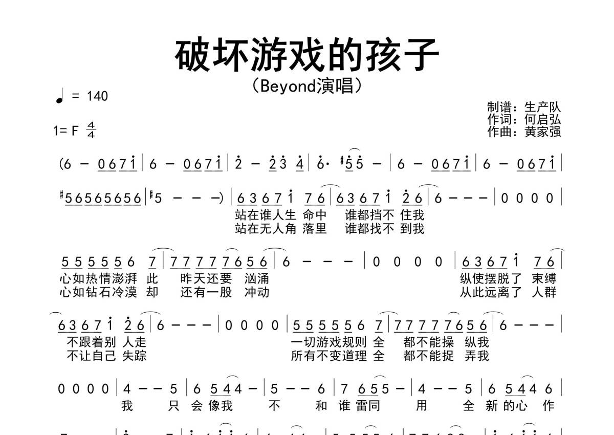 《破坏游戏的孩子》是Beyond演唱的一首歌曲,拍号为4/4拍,歌曲速度为每分钟140拍,这份简谱共有一张高清图谱,图谱由 @生产队 编配上传Beyond演唱的歌曲《破坏游戏的孩子》简谱。