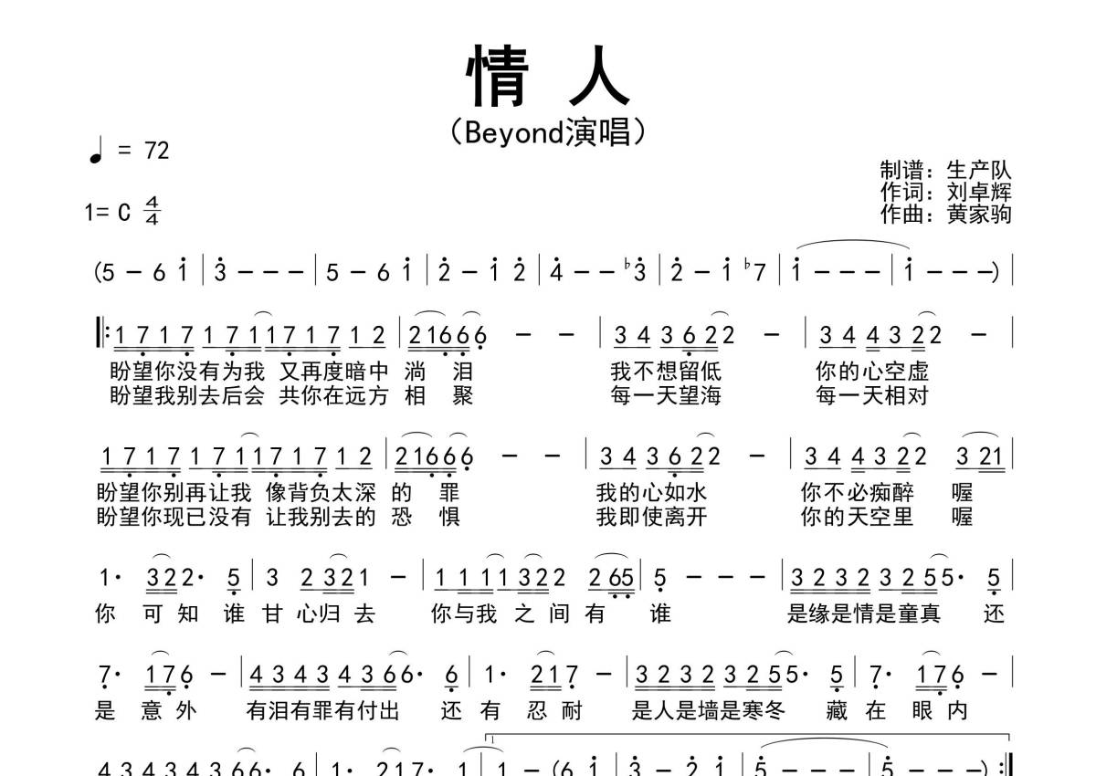 《情人》是Beyond演唱的一首歌曲,拍号为4/4拍,歌曲速度为每分钟72拍,这份简谱共有一张高清图谱,图谱由 @生产队 编配上传Beyond演唱的歌曲《情人》简谱。
