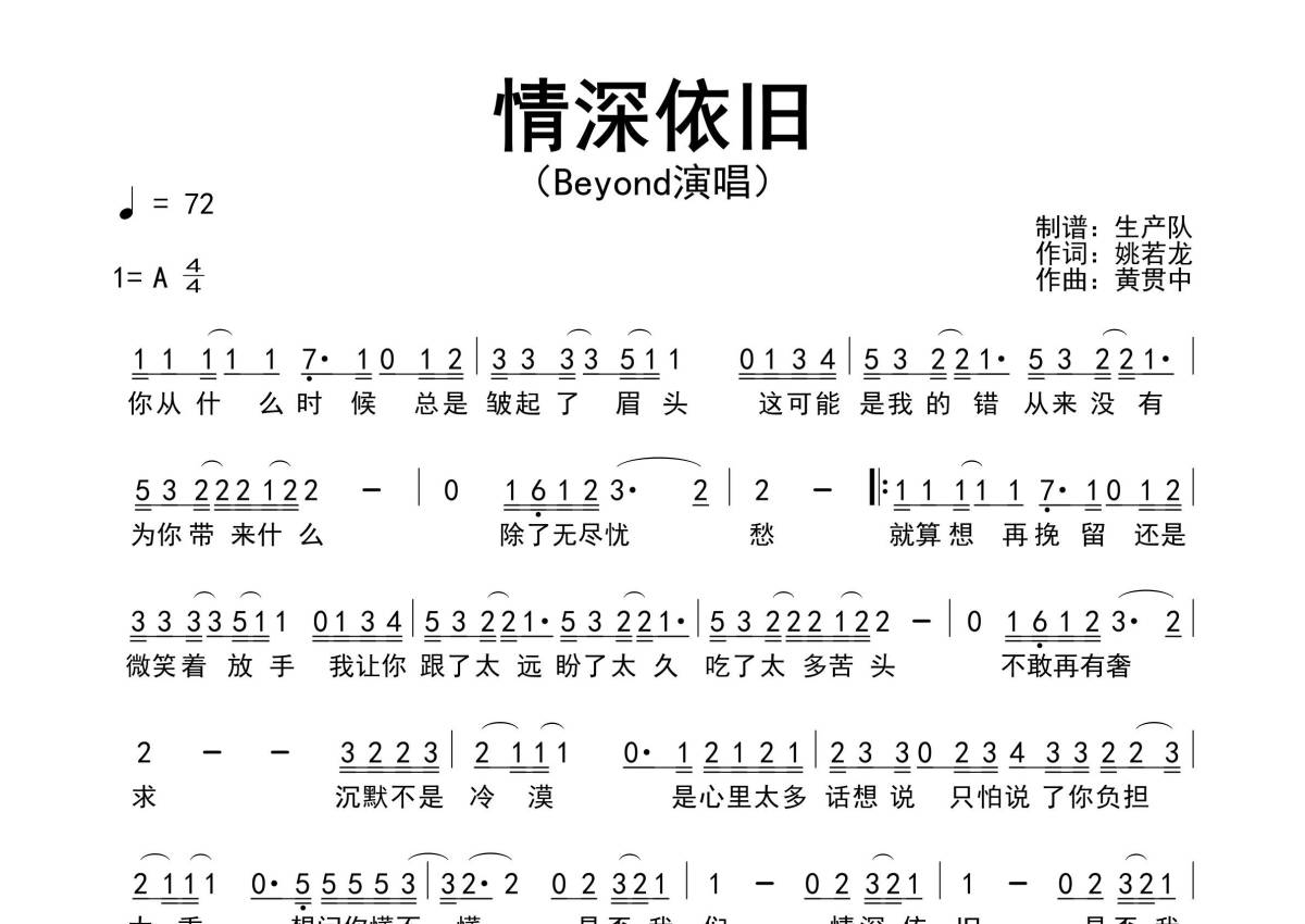 《情深依旧》是Beyond演唱的一首歌曲,拍号为4/4拍,歌曲速度为每分钟72拍,这份简谱共有一张高清图谱,图谱由 @生产队 编配上传Beyond演唱的歌曲《情深依旧》简谱。