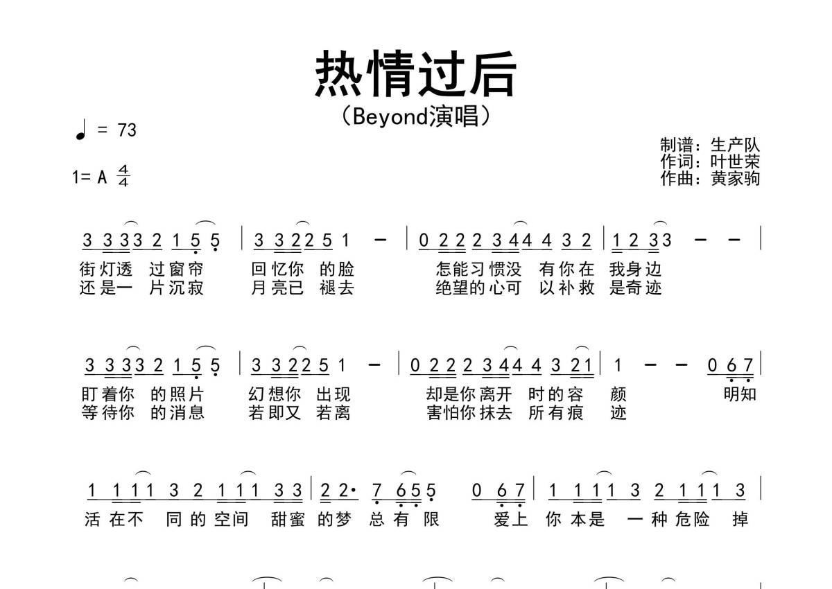 《热情过后》是Beyond演唱的一首歌曲,拍号为4/4拍,歌曲速度为每分钟73拍,这份简谱共有一张高清图谱,图谱由 @生产队 编配上传Beyond演唱的歌曲《热情过后》简谱。