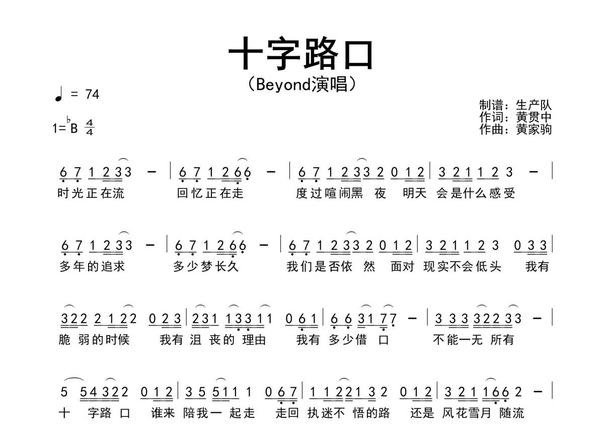 《十字路口》是Beyond演唱的一首歌曲,拍号为4/4拍,歌曲速度为每分钟74拍,这份简谱共有一张高清图谱,图谱由 @生产队 编配上传Beyond演唱的歌曲《十字路口》简谱。