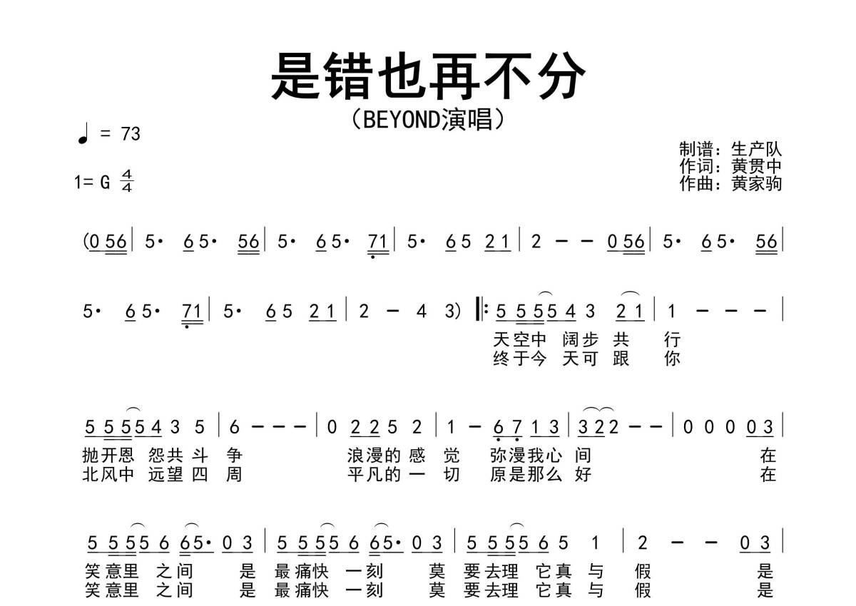 《是错也再不分》是Beyond演唱的一首歌曲,拍号为4/4拍,歌曲速度为每分钟73拍,这份简谱共有一张高清图谱,图谱由 @生产队 编配上传Beyond演唱的歌曲《是错也再不分》简谱。
