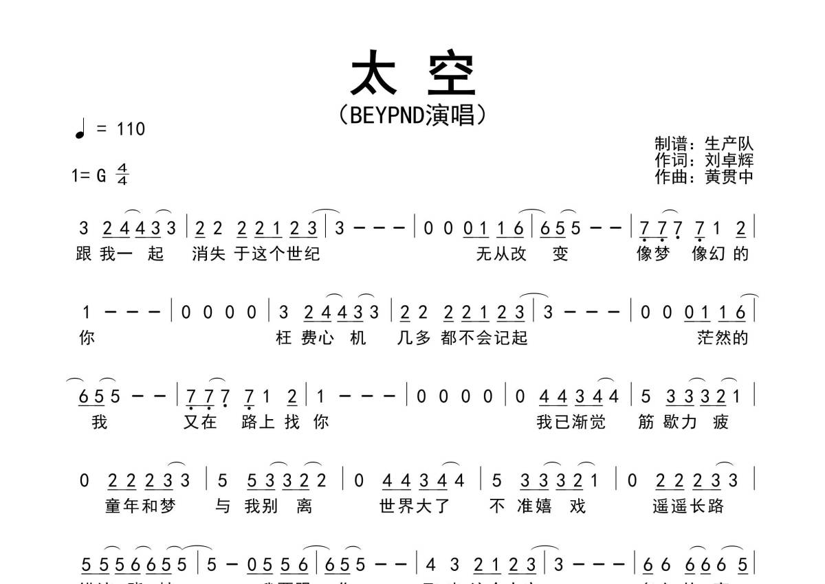 《太空》是Beyond演唱的一首歌曲,拍号为4/4拍,歌曲速度为每分钟110拍,这份简谱共有一张高清图谱,图谱由 @生产队 编配上传Beyond演唱的歌曲《太空》简谱。