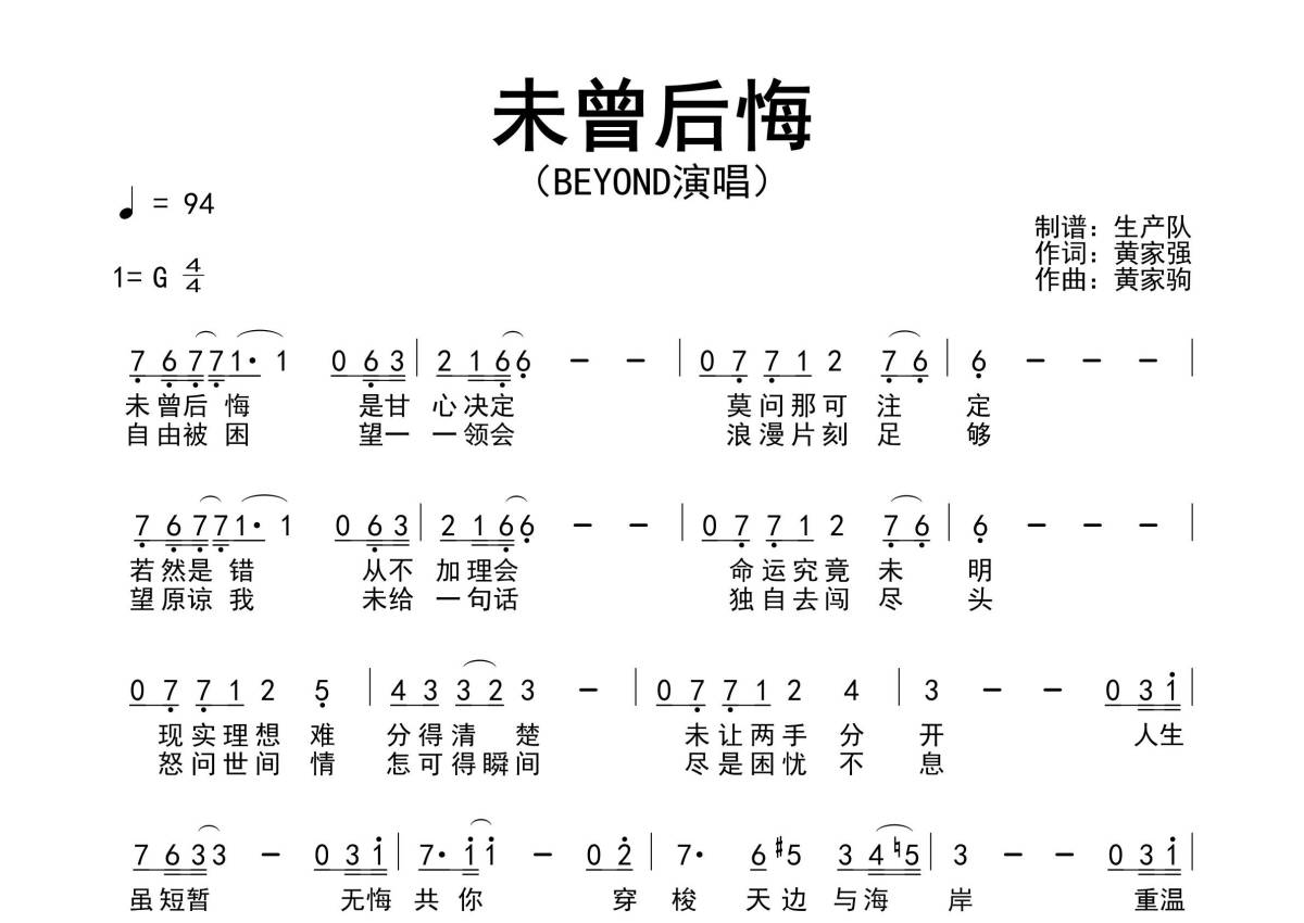《未曾后悔》是Beyond演唱的一首歌曲,拍号为4/4拍,歌曲速度为每分钟94拍,这份简谱共有一张高清图谱,图谱由 @生产队 编配上传Beyond演唱的歌曲《未曾后悔》简谱。