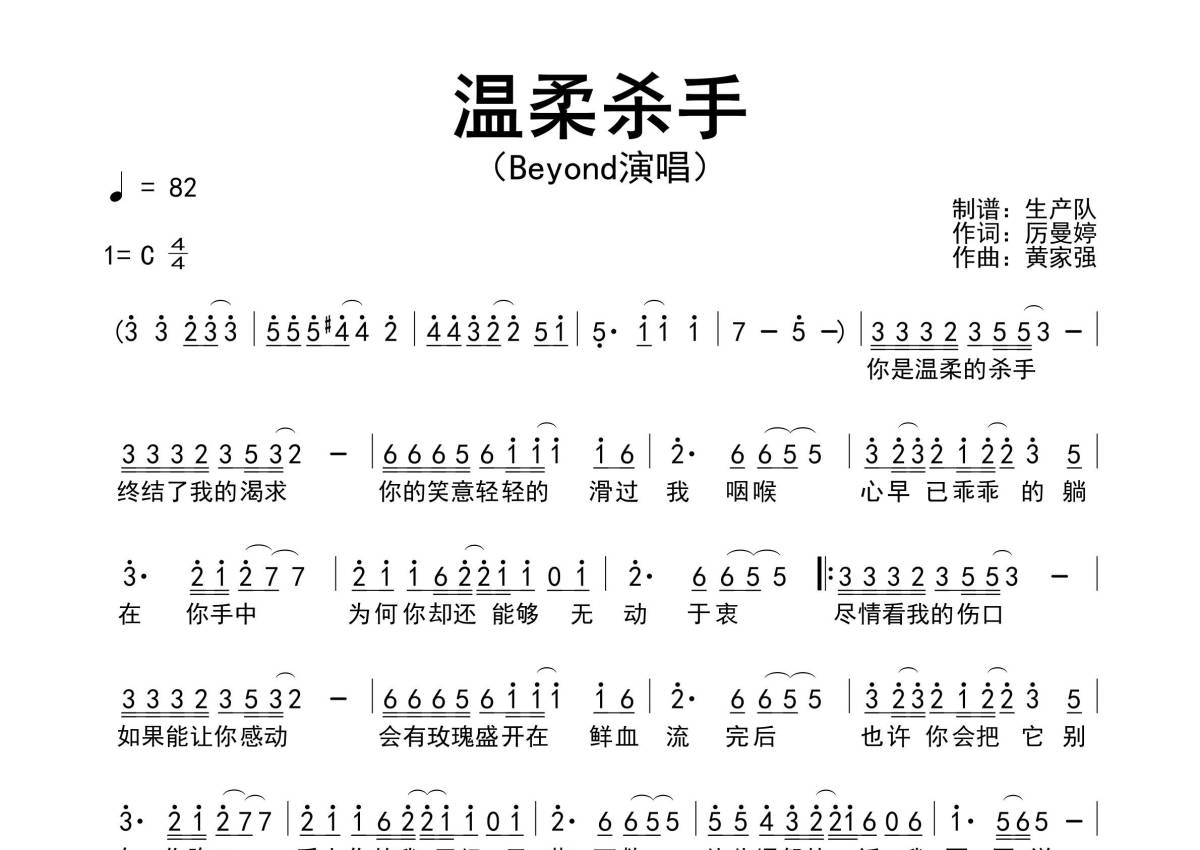 《温柔杀手》是Beyond演唱的一首歌曲,拍号为4/4拍,歌曲速度为每分钟82拍,这份简谱共有一张高清图谱,图谱由 @生产队 编配上传Beyond演唱的歌曲《温柔杀手》简谱。