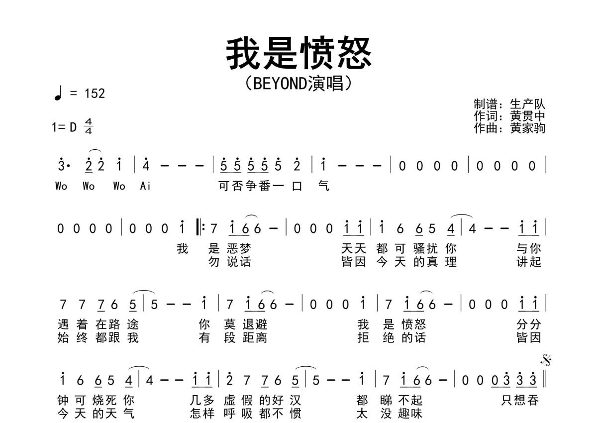 《我是愤怒》是Beyond演唱的一首歌曲,拍号为4/4拍,歌曲速度为每分钟152拍,这份简谱共有一张高清图谱,图谱由 @生产队 编配上传Beyond演唱的歌曲《我是愤怒》简谱。