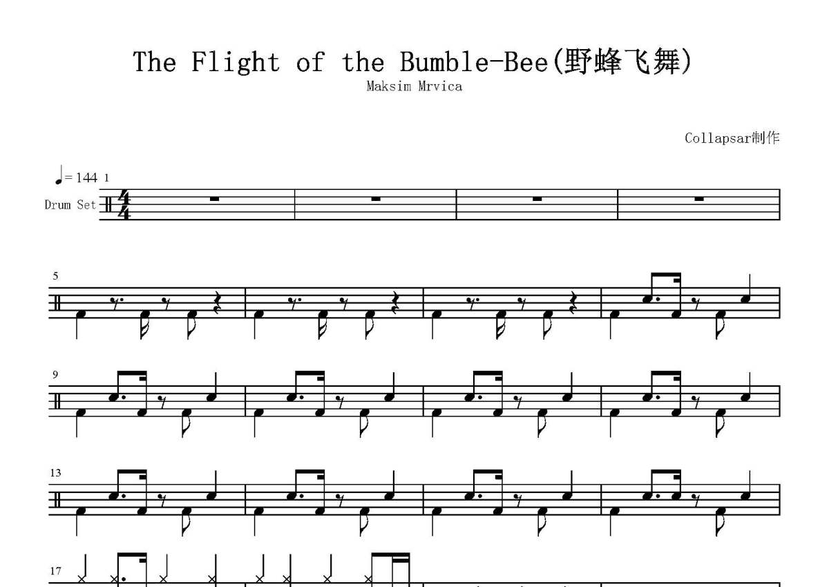 《野蜂飞舞》是Maksim Mrvica演唱的一首歌曲,这份鼓谱共有四张高清图谱,图谱由 @打鼓谱 编配上传,图谱使用五线谱编配,使用这份野蜂飞舞架子鼓谱,你将能够轻松地敲打出这首Maksim Mrvica的野蜂飞舞,快来尝试吧。尼古拉于1899年到1900年间,基于亚历山大·谢尔盖耶维奇·普希金的诗作改编为同名歌剧《萨旦王的故事》。其中第3幕第1场为描述王子变化为大黄蜂攻击2个反派角色的情形,此时的配乐即为此曲。由于此曲的旋律极快,后人常选用此曲作为展示钢琴、小提琴等乐器的演奏技巧。