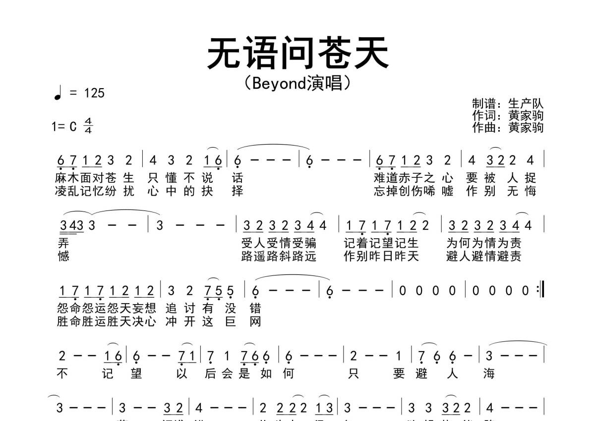 《无语问苍天》是Beyond演唱的一首歌曲,拍号为4/4拍,歌曲速度为每分钟125拍,这份简谱共有一张高清图谱,图谱由 @生产队 编配上传Beyond演唱的歌曲《无语问苍天》简谱。