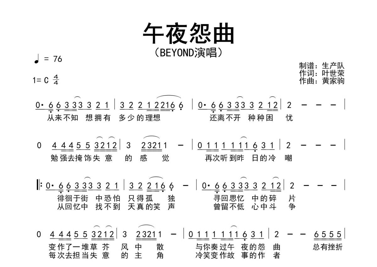 《午夜怨曲》是Beyond演唱的一首歌曲,拍号为4/4拍,歌曲速度为每分钟76拍,这份简谱共有一张高清图谱,图谱由 @生产队 编配上传Beyond演唱的歌曲《午夜怨曲》简谱。