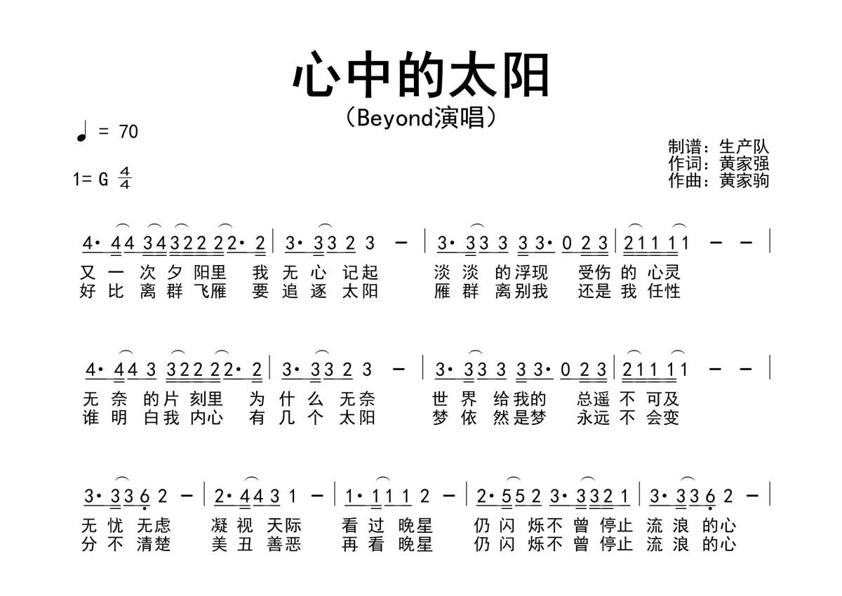 《心中的太阳》是Beyond演唱的一首歌曲,拍号为4/4拍,歌曲速度为每分钟70拍,这份简谱共有一张高清图谱,图谱由 @生产队 编配上传Beyond演唱的歌曲《心中的太阳》简谱。