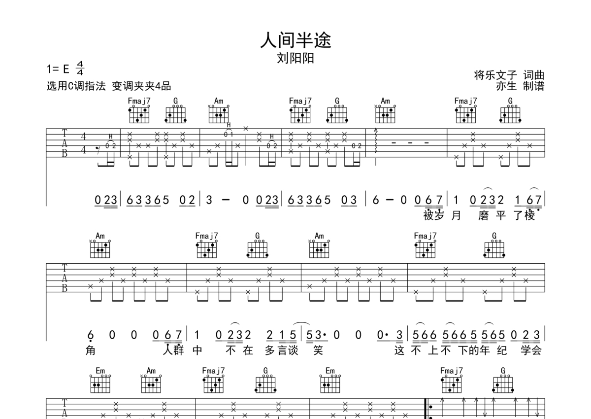 《人间半途》是刘阳阳演唱的一首歌曲,拍号为4/4拍,歌曲原调为E调,但由于原调指法比较难,为了方便弹奏,本吉他谱采用的是C调指法编配,变调夹4品弹奏即为原调,当然也可以根据自己的音域改变变调夹位置,或者通过改变和弦调性,以方便自己弹奏,这份吉他谱共有两张高清图谱,图谱由 @亦生 编配上传,图谱使用六线谱编配,包含吉他和弦指法、简谱以及歌词部分,使用这份人间半途吉他谱,可以让你更加方便地掌握这首歌曲的弹唱技巧,快来尝试吧。