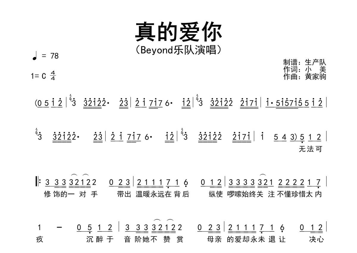 《真的爱你》是Beyond演唱的一首歌曲,精编完美版,拍号为4/4拍,歌曲速度为每分钟78拍,这份简谱共有两张高清图谱,图谱由 @生产队 编配上传Beyond演唱的歌曲《真的爱你》简谱。
