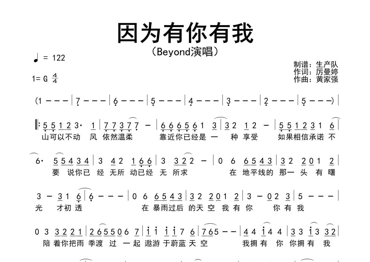 《因为有你有我》是Beyond演唱的一首歌曲,拍号为4/4拍,歌曲速度为每分钟122拍,这份简谱共有一张高清图谱,图谱由 @生产队 编配上传Beyond演唱的歌曲《因为有你有我》简谱。