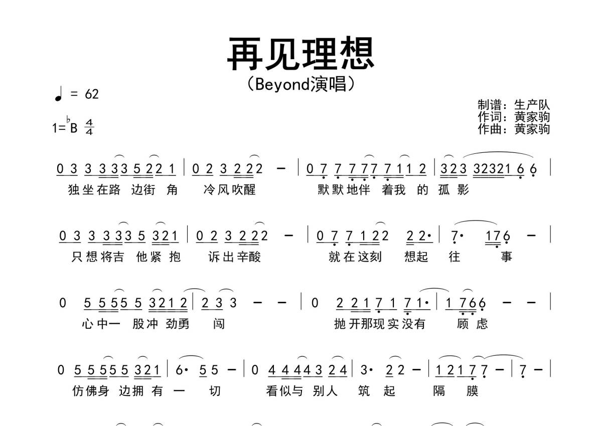 《再见理想》是Beyond演唱的一首歌曲,拍号为4/4拍,歌曲速度为每分钟62拍,这份简谱共有一张高清图谱,图谱由 @生产队 编配上传Beyond演唱的歌曲《再见理想》简谱。