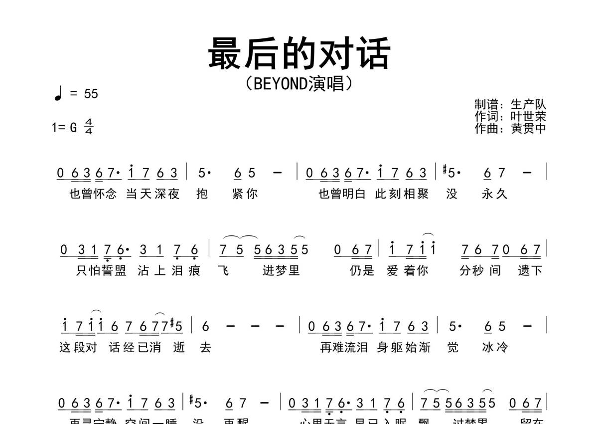 《最后的对话》是Beyond演唱的一首歌曲,拍号为4/4拍,歌曲速度为每分钟55拍,这份简谱共有一张高清图谱,图谱由 @生产队 编配上传Beyond演唱的歌曲《最后的对话》简谱。