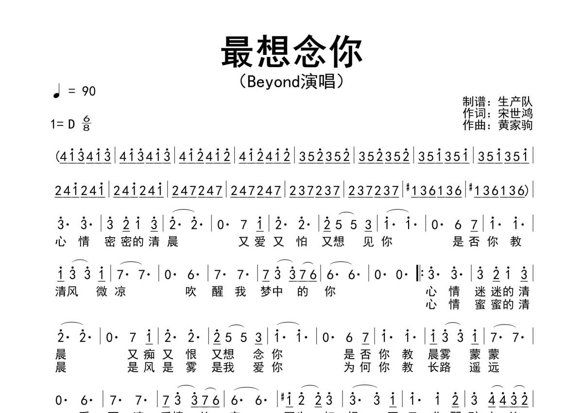 《最想念你》是Beyond演唱的一首歌曲,拍号为6/8拍,歌曲速度为每分钟90拍,这份简谱共有一张高清图谱,图谱由 @生产队 编配上传Beyond演唱的歌曲《最想念你》简谱。