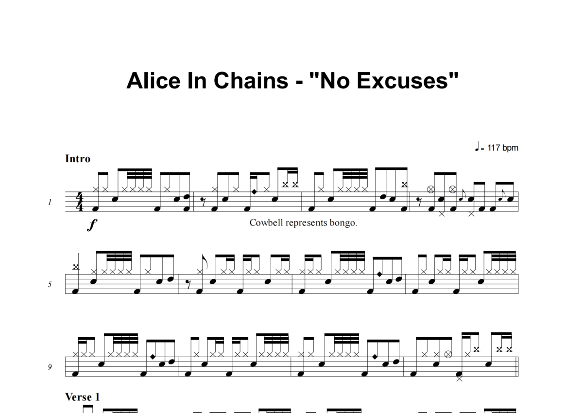 《No Excuses》是Alice In Chains演唱的一首歌曲,这份架子鼓谱共有四张高清图谱,图谱由 @Sawubona 编配上传,图谱使用五线谱编配,使用这份No Excuses架子鼓谱,你将能够轻松地敲打出这首Alice In Chains的No Excuses,快来尝试吧。