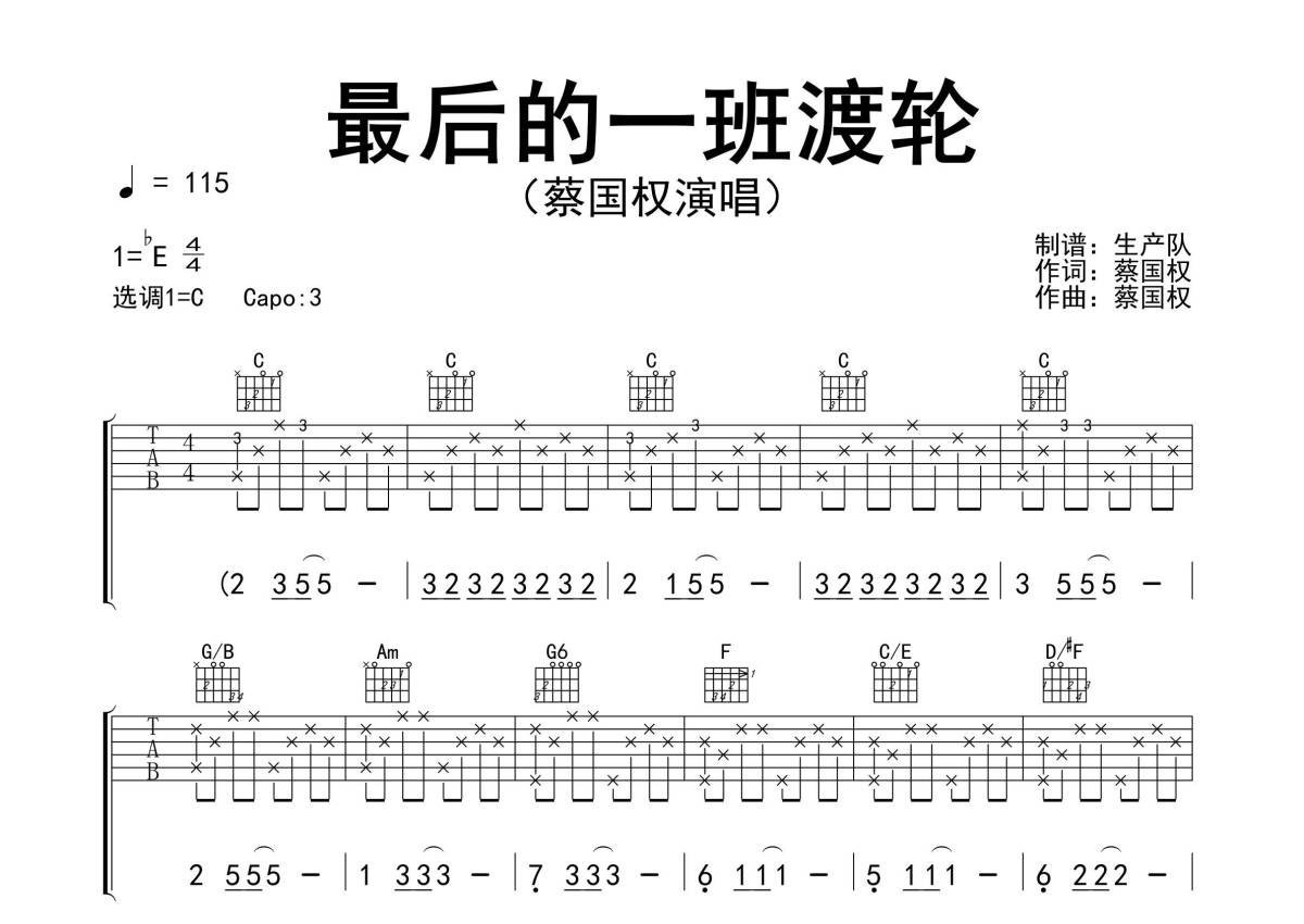 《最后的一班渡轮》是蔡国权演唱的一首歌曲,精编完美版,拍号为4/4拍,歌曲速度为每分钟115拍,歌曲原调为Eb调,但由于原调指法比较难,为了方便弹奏,本吉他谱采用的是C调指法编配,变调夹3品弹奏即为原调,当然也可以根据自己的音域改变变调夹位置,或者通过改变和弦调性,以方便自己弹奏,这份吉他谱共有三张高清图谱,图谱由 @生产队 编配上传,图谱使用六线谱编配,包含吉他和弦指法、简谱以及歌词部分,使用这份最后的一班渡轮吉他谱,可以让你更加方便地掌握这首歌曲的弹唱技巧,快来尝试吧。《最后的一班轮渡》是蔡国权演唱的歌曲,由蔡国权作词作曲,收录于《蔡国权创作白金版》专辑中。本吉他谱根据原版采用C调指法编配,精准的前奏、间奏和solo编配,怀旧经典!。