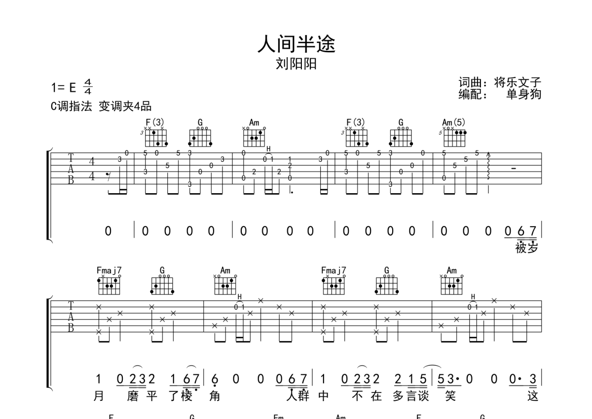 人间半途吉他谱 - 刘阳阳 - C调弹唱六线谱