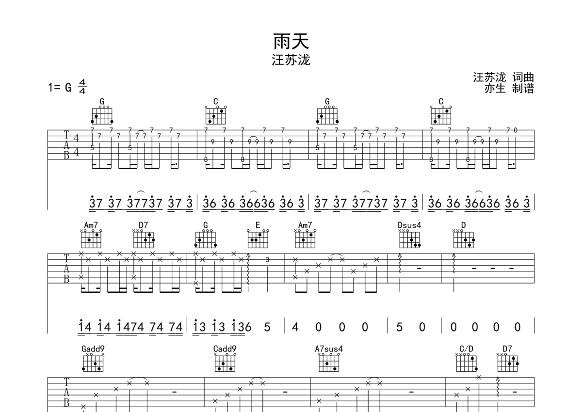 汪苏泷《雨天》吉他谱 - G调弹唱六线谱