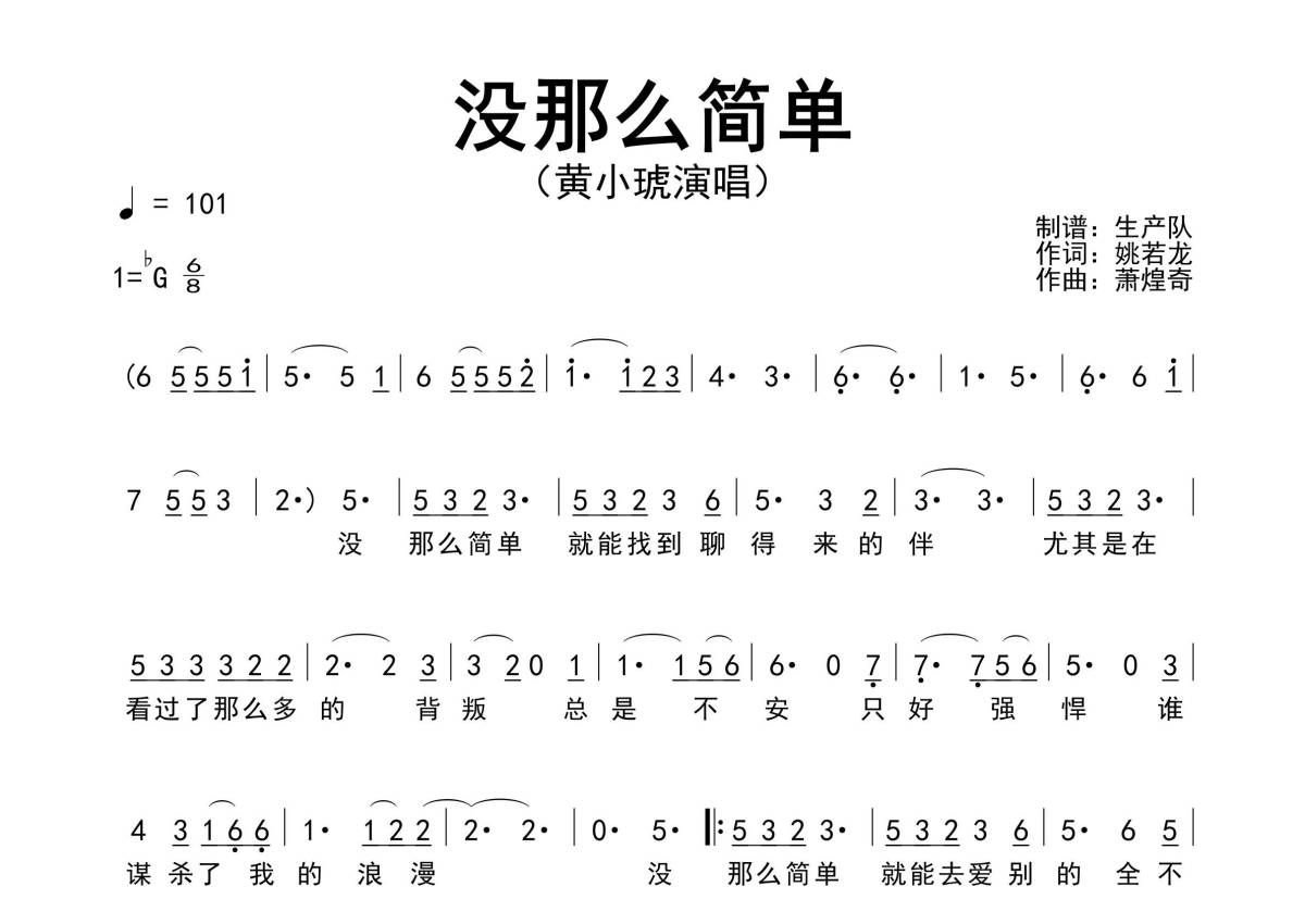 《没那么简单》是黄小琥演唱的一首歌曲,原版简谱,拍号为6/8拍,歌曲速度为每分钟101拍,这份简谱共有两张高清图谱,图谱由 @生产队 编配上传黄小琥演唱的经典歌曲《没那么简单》原版简谱。