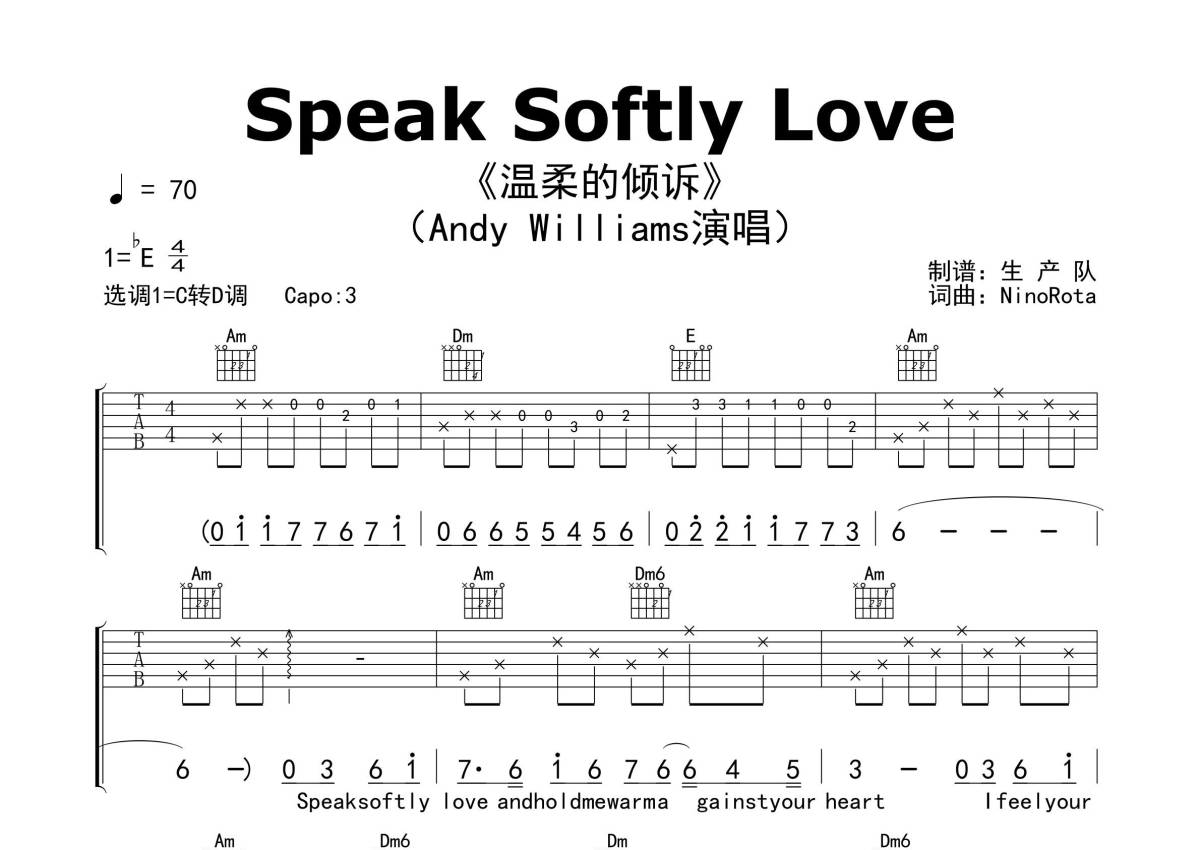 《Speak Softly Love(温柔的倾诉)》是温柔的倾诉演唱的一首歌曲,精编完美版,拍号为4/4拍,歌曲速度为每分钟70拍,歌曲原调为Eb调,但由于原调指法比较难,为了方便弹奏,本吉他谱采用的是C调指法编配,变调夹3品弹奏即为原调,当然也可以根据自己的音域改变变调夹位置,或者通过改变和弦调性,以方便自己弹奏,这份吉他谱共有三张高清图谱,图谱由 @生产队 编配上传,图谱使用六线谱编配,包含吉他和弦指法、简谱以及歌词部分,使用这份Speak Softly Love(温柔的倾诉)吉他谱,可以让你更加方便地掌握这首歌曲的弹唱技巧,快来尝试吧。《Speak softly love》是由Andy Williams演唱的一首歌曲,中文译名《温柔的倾诉》,收录于《The Essence of Andy Williams》之中,是电影《教父》的主题曲。本吉他谱根据原版采用C转D调指法编配,精编完美版,怀旧经典!。