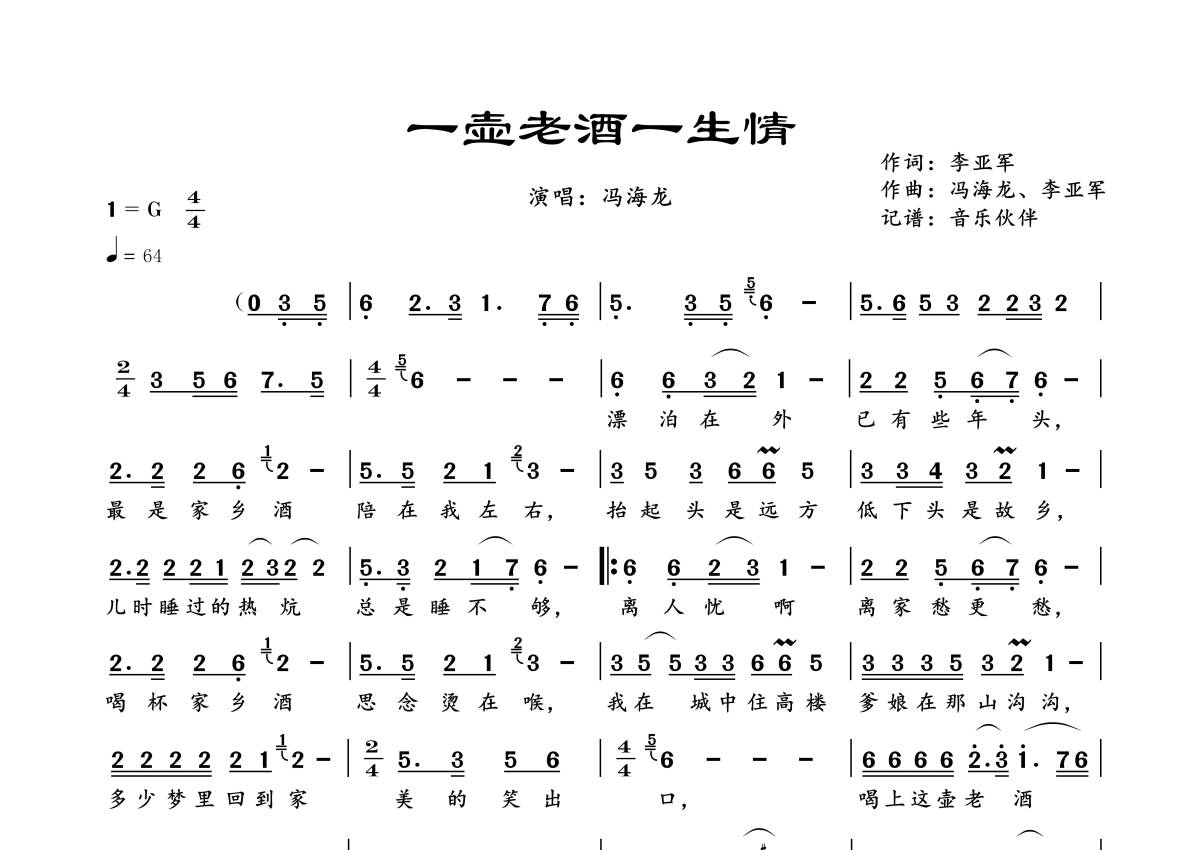 《一壶老酒一生情》是冯海龙演唱的一首歌曲,拍号为4/4拍,歌曲速度为每分钟64拍,这份简谱共有一张高清图谱,图谱由 @音乐伙伴 编配上传。