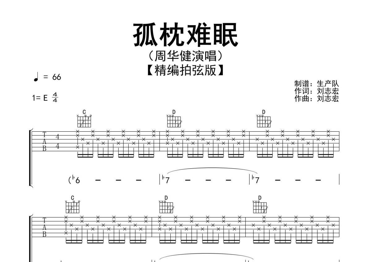 《孤枕难眠》是周华健演唱的一首歌曲,精编拍弦版,歌曲速度为每分钟66拍,歌曲原调为E调,但由于原调指法比较难,为了方便弹奏,本吉他谱采用的是E调指法编配,演奏时不需要使用变调夹即为原调,这份吉他谱共有三张高清图谱,图谱由 @生产队 编配上传,图谱使用六线谱编配,包含吉他和弦指法、简谱以及歌词部分,使用这份孤枕难眠吉他谱,可以让你更加方便地掌握这首歌曲的弹唱技巧,快来尝试吧。《孤枕难眠》是周华健演唱的一首歌曲,刘志宏作词、作曲,收录于周华健1993年4月20日由滚石唱片发行的专辑《花心》中。本吉他谱根据原版E调指法编配,副歌采用拍弦节奏,效果很好,怀旧经典。