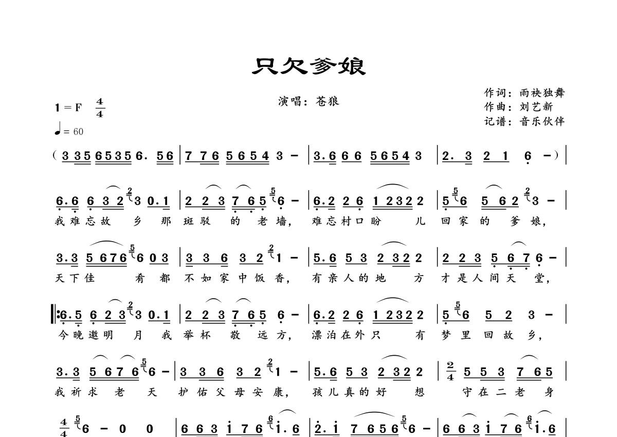《只欠爹娘》是苍狼演唱的一首歌曲,拍号为4/4拍,歌曲速度为每分钟60拍,这份简谱共有一张高清图谱,图谱由 @音乐伙伴 编配上传。