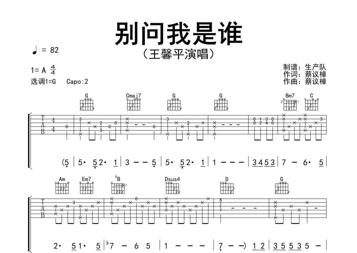 《别问我是谁》是王馨平演唱的一首歌曲,精编完美版,拍号为4/4拍,歌曲速度为每分钟82拍,歌曲原调为A调,但由于原调指法比较难,为了方便弹奏,本吉他谱采用的是G调指法编配,变调夹2品弹奏即为原调,当然也可以根据自己的音域改变变调夹位置,或者通过改变和弦调性,以方便自己弹奏,这份吉他谱共有三张高清图谱,图谱由 @生产队 编配上传,图谱使用六线谱编配,包含吉他和弦指法、简谱以及歌词部分,使用这份别问我是谁吉他谱,可以让你更加方便地掌握这首歌曲的弹唱技巧,快来尝试吧。《别问我是谁》是王馨平演唱的歌曲,由蔡议樟填词,蔡议樟谱曲,收录在专辑《宝丽金黄金时代精品典藏VOL3》中。本吉他谱根据原版采用G调指法编配,完整的前奏,间奏和SOLO编配,精编完美版,怀旧经典!。