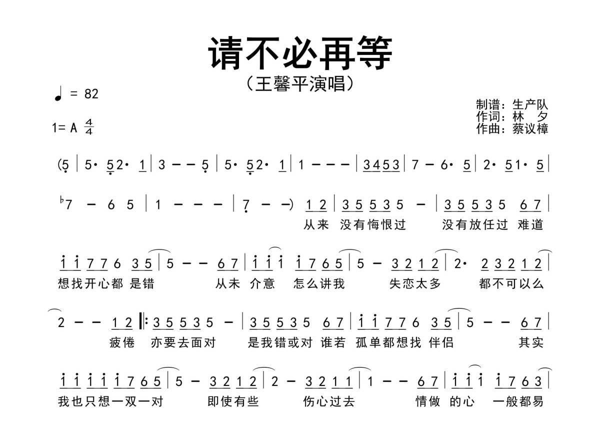 《请不必再等》是王馨平演唱的一首歌曲,原版简谱,拍号为4/4拍,歌曲速度为每分钟82拍,这份简谱共有一张高清图谱,图谱由 @生产队 编配上传王馨平演唱的经典歌曲《请不必再等》原版简谱。