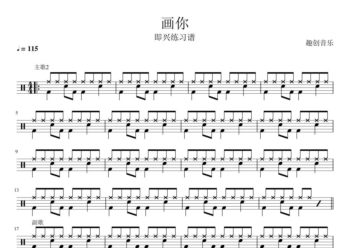 《画你》是科尔沁夫演唱的一首歌曲,拍号为4/4拍,这份架子鼓谱共有一张高清图谱,图谱由 @陈老师 编配上传,图谱使用五线谱编配,使用这份画你架子鼓谱,你将能够轻松地敲打出这首科尔沁夫的画你,快来尝试吧。
