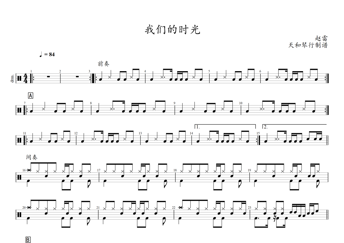 《我们的时光》是赵雷演唱的一首歌曲,拍号为4/4拍,歌曲速度为每分钟84拍,这份架子鼓谱共有两张高清图谱,图谱由 @音符喷血者 编配上传,图谱使用五线谱编配,使用这份我们的时光架子鼓谱,你将能够轻松地敲打出这首赵雷的我们的时光,快来尝试吧。