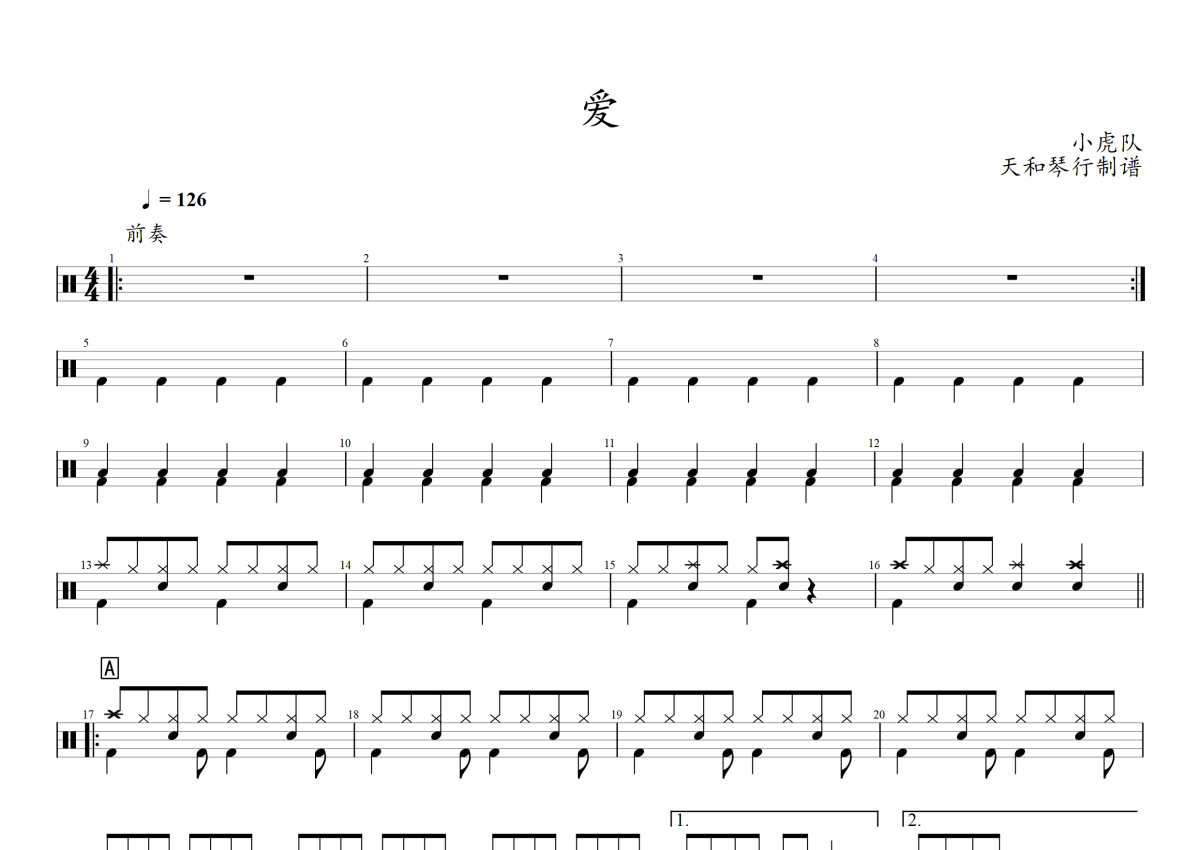 《爱》是小虎队演唱的一首歌曲,这份架子鼓谱共有三张高清图谱,图谱由 @音符喷血者 编配上传,图谱使用五线谱编配,使用这份爱架子鼓谱,你将能够轻松地敲打出这首小虎队的爱,快来尝试吧。